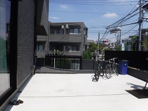 駐車場脇の階段を上がった先が玄関ですが、その奥にコンクリートの庭が広がります。